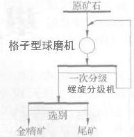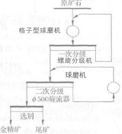 通過對當(dāng)時生產(chǎn)工藝流程的考察與計(jì)算,發(fā)現(xiàn)制約提高生產(chǎn)處理能力的瓶頸主要在磨礦和選別作業(yè)。破碎和脫水只須作適當(dāng)調(diào)整即可滿足改造后的工藝需求。