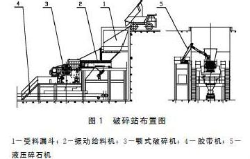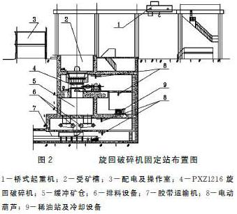 國內(nèi)以旋回破碎機作為主機的破碎站大都是固定破碎站,國外同類產(chǎn)品中雖有相近能力的半移動破碎站,因為價格或者其他因素,在國內(nèi)應用較少。所以以固定式破碎站作為比較對象,其配置如圖2。